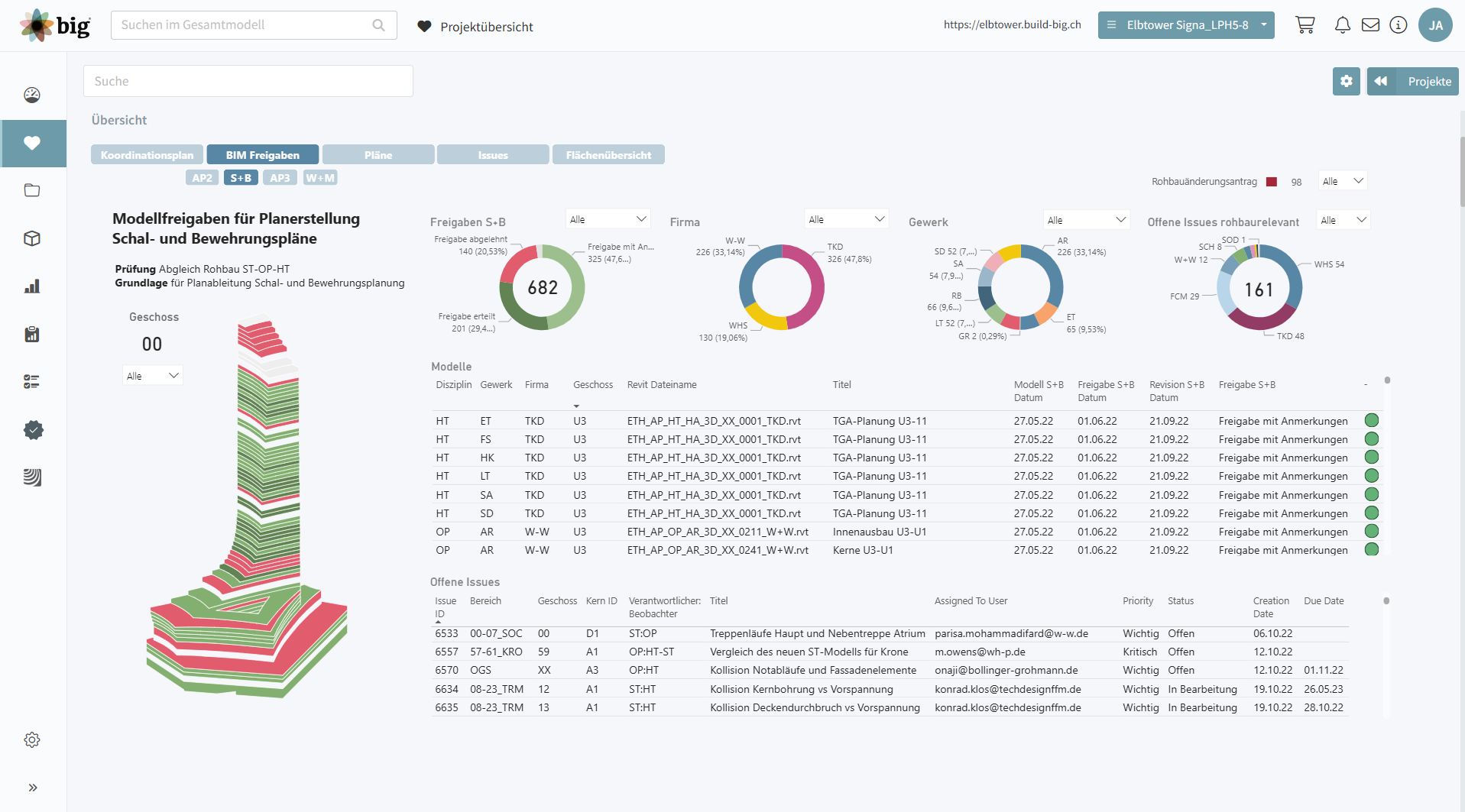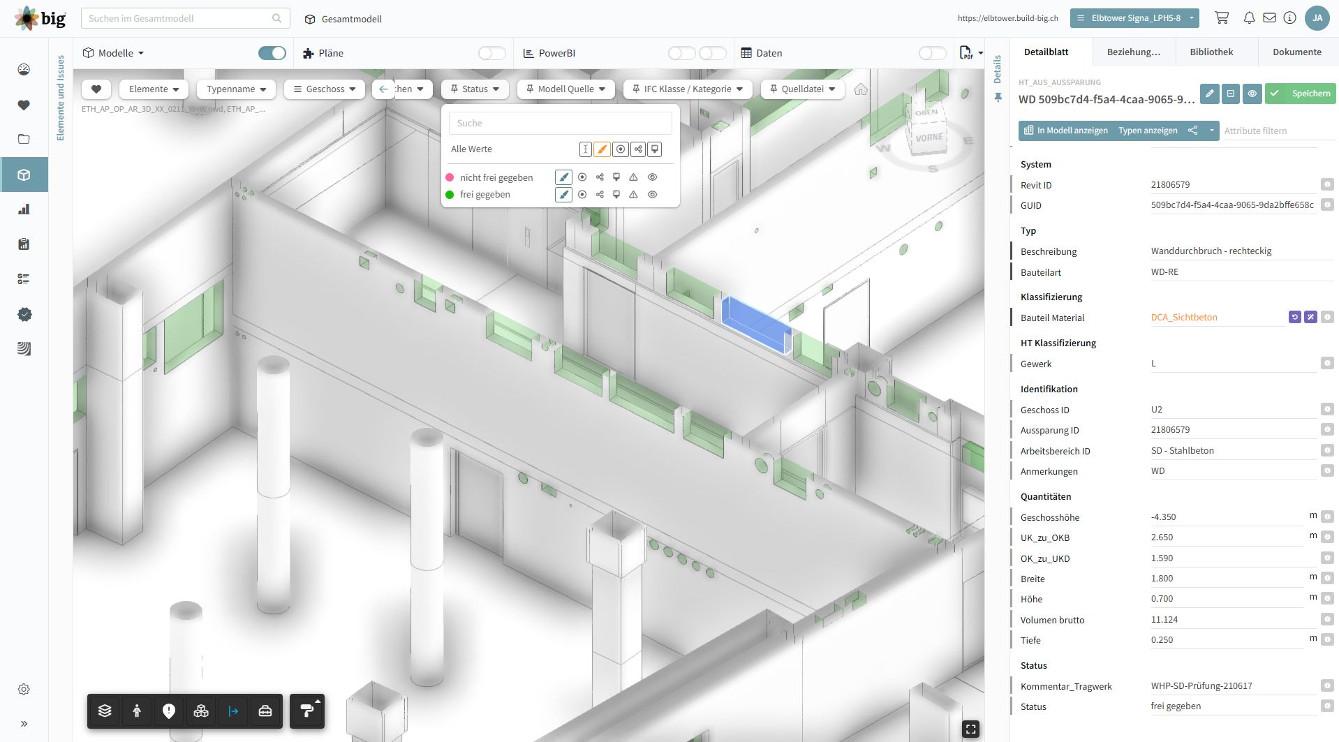 The model-based SOD process with big® consolidates all relevant models and enables precise identification of every opening through well-defined attributes and a consistent ID structure. Reviews happen directly in the model: statuses, comments, and changes are documented on the object, approval status is automatically determined, and all information is centrally evaluated. Model comparisons, structured lists, and seamless tracking ensure maximum transparency and traceability, making collaboration between MEP, architecture, and structural engineering more efficient and reliable.